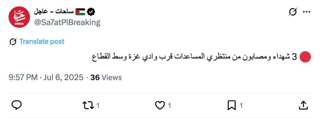 Three martyrs and wounded among those waiting for aid near Wadi Gaza in the central Gaza Strip.