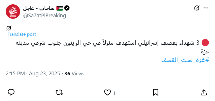 Three martyrs in an Israeli bombing that targeted a house in the Zeitoun neighborhood, southeast of Gaza City.