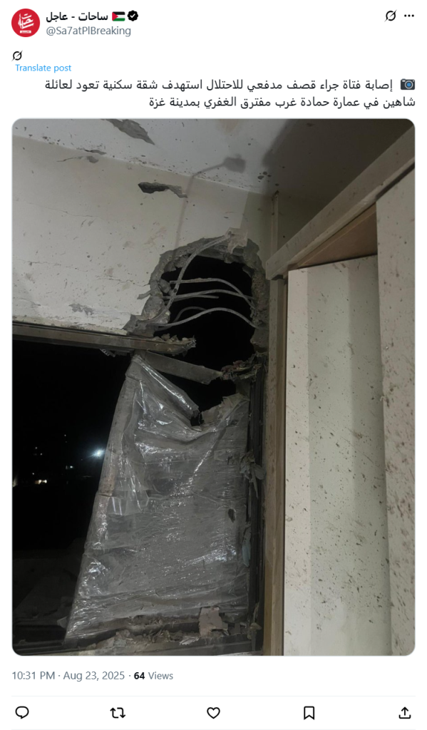 إصابة فتاة جراء قصف مدفعي للاحتلال استهدف شقة سكنية تعود لعائلة شاهين في عمارة حمادة غرب مفترق الغفري بمدينة غزة
