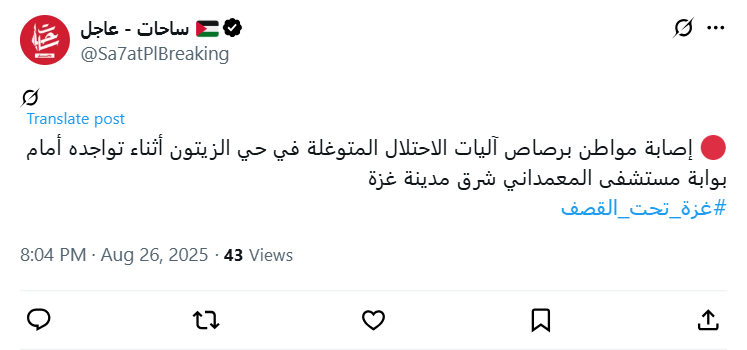 إصابة مواطن برصاص آليات الاحتلال المتوغلة في حي الزيتون أثناء تواجده أمام بوابة مستشفى المعمداني شرق مدينة غزة