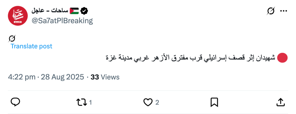 Two martyrs in an Israeli bombing near Al-Azhar Junction, west of Gaza City.