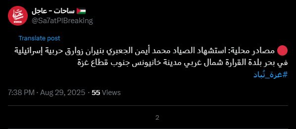 Local sources: Fisherman Mohammed Ayman al-Ja'bari was killed by Israeli gunboat fire off the coast of al-Qarara, northwest of Khan Yunis, in the southern Gaza Strip. #Gaza_is_being_annihilated.