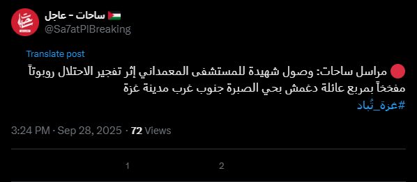 Sahat correspondent: A martyr arrived at the Baptist Hospital after the occupation forces detonated a booby-trapped robot in the Daghmash family square in the Sabra neighborhood, southwest of Gaza City. #Gaza_is_being_annihilated.