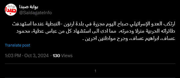 This morning, the Israeli enemy committed a massacre in the town of Arnoun, Nabatieh, when its warplanes targeted a house and destroyed it, leading to the martyrdom of Abbas Attia, Mahmoud Assaf, and Ibrahim Assaf, and the wounding of other citizens.