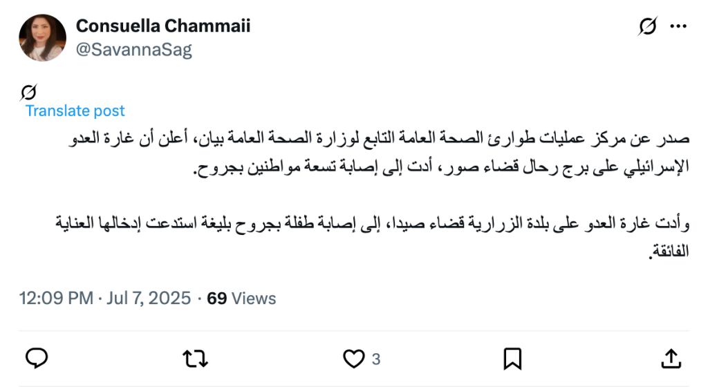 The Public Health Emergency Operations Center of the Ministry of Public Health issued a statement announcing that an Israeli airstrike on the Rahhal Tower in the Tyre district resulted in nine citizens being injured. An Israeli airstrike on the town of Zrarieh in the Sidon district resulted in a child being seriously injured, requiring her admission to intensive care.