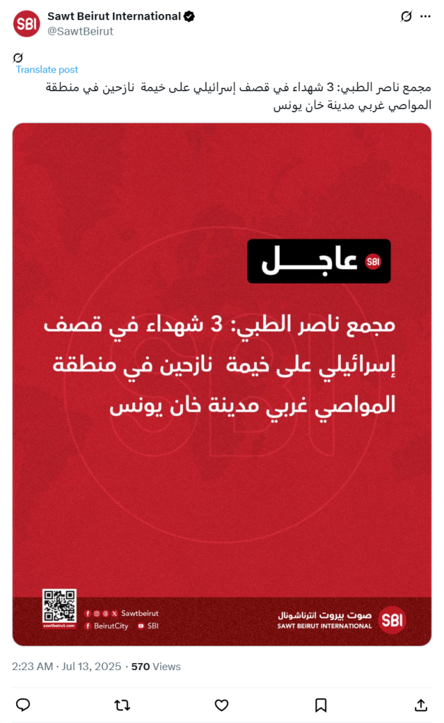 Nasser Medical Complex: 3 martyrs in an Israeli bombardment of a displaced persons' tent in the Al-Mawasi area, west of Khan Yunis.