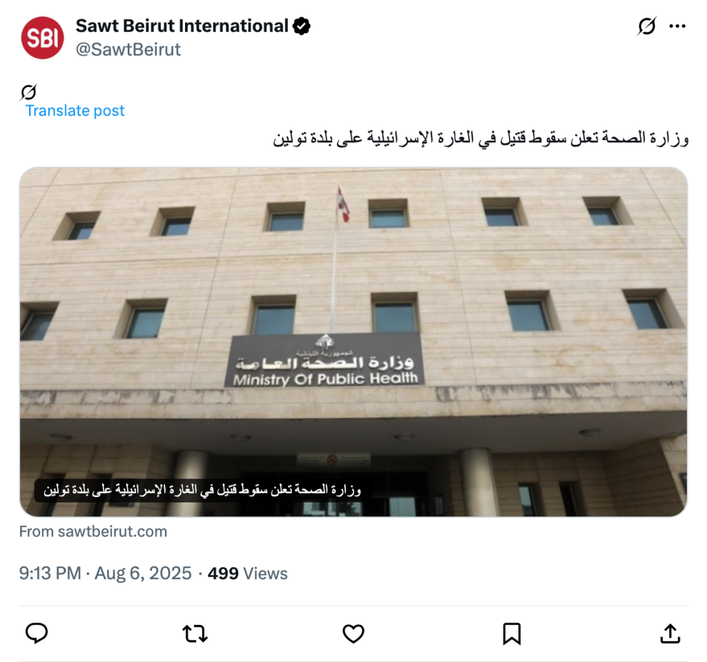 وزارة الصحة تعلن سقوط قتيل في الغارة الإسرائيلية على بلدة تولين