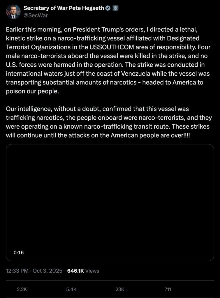 Earlier this morning, on President Trump's orders, I directed a lethal, kinetic strike on a narco-trafficking vessel affiliated with Designated Terrorist Organizations in the USSOUTHCOM area of responsibility. Four male narco-terrorists aboard the vessel were killed in the strike, and no U.S. forces were harmed in the operation. The strike was conducted in international waters just off the coast of Venezuela while the vessel was transporting substantial amounts of narcotics - headed to America to poison our people.