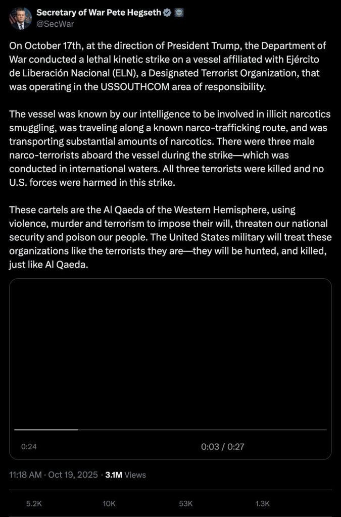 On October 17th, at the direction of President Trump, the Department of War conducted a lethal kinetic strike on a vessel affiliated with Ejército de Liberación Nacional (ELN), a Designated Terrorist Organization, that was operating in the USSOUTHCOM area of responsibility.
