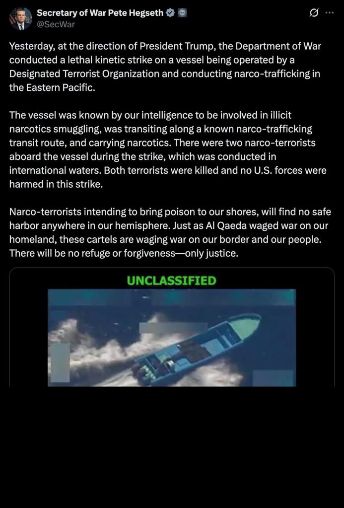 Yesterday, at the direction of President Trump, the Department of War conducted a lethal kinetic strike on a vessel being operated by a Designated Terrorist Organization and conducting narco-trafficking in the Eastern Pacific.