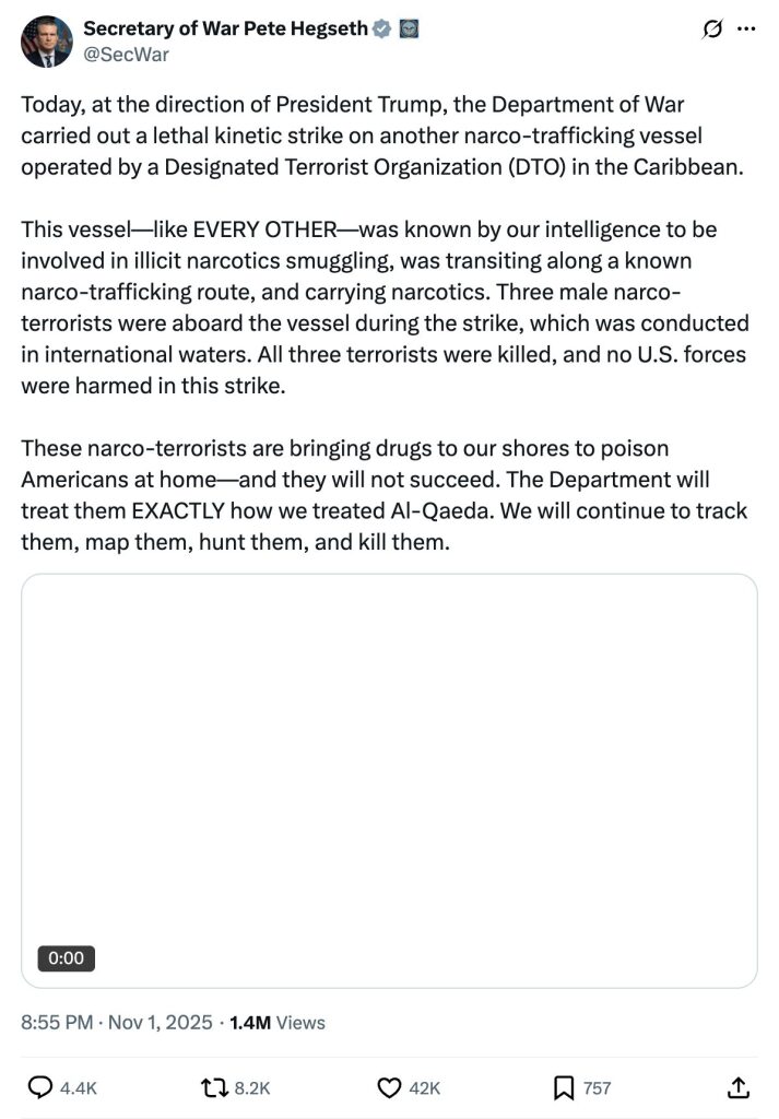 Today, at the direction of President Trump, the Department of War carried out a lethal kinetic strike on another narco-trafficking vessel operated by a Designated Terrorist Organization (DTO) in the Caribbean.