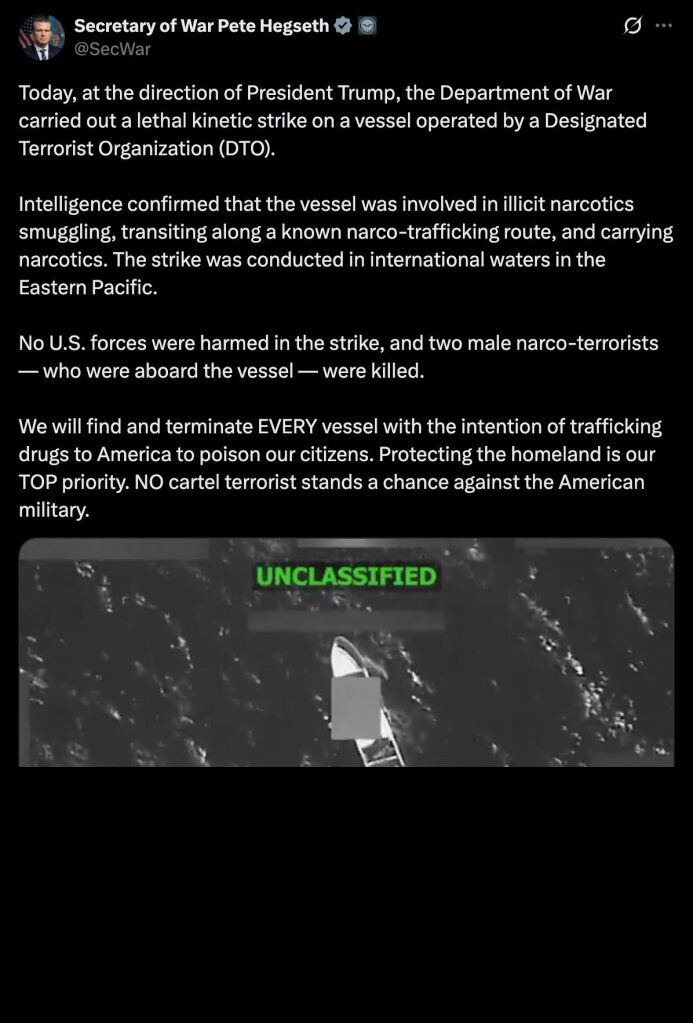 Today, at the direction of President Trump, the Department of War carried out a lethal kinetic strike on a vessel operated by a Designated Terrorist Organization (DTO).