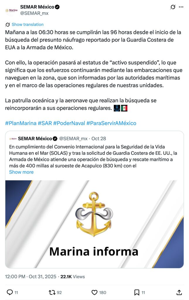 Con ello, la operación pasará al estatus de “activo suspendido”, lo que significa que los esfuerzos continuarán mediante las embarcaciones que naveguen en la zona, que son informadas por las autoridades marítimas y en el marco de las operaciones regulares de nuestras unidades.