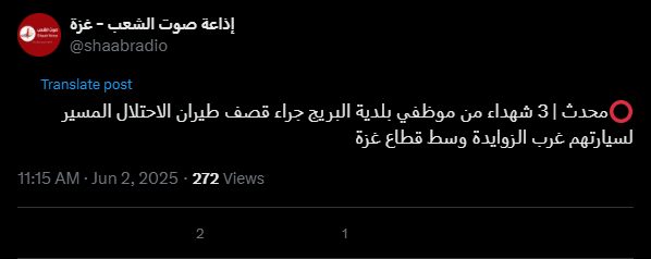 Updated | 3 Al-Bureij Municipality employees martyred as a result of an Israeli drone attack on their car west of Al-Zawayda, central Gaza Strip.