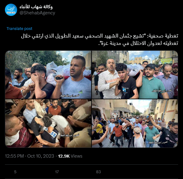 Press coverage: "The funeral of martyred journalist Saeed al-Tawil, who was killed while covering the occupation's aggression in Gaza City, is being held."