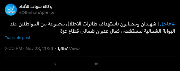 #Urgent | Two martyrs and wounded after occupation aircraft targeted a group of citizens at the northern gate of Kamal Adwan Hospital, north of the Gaza Strip.