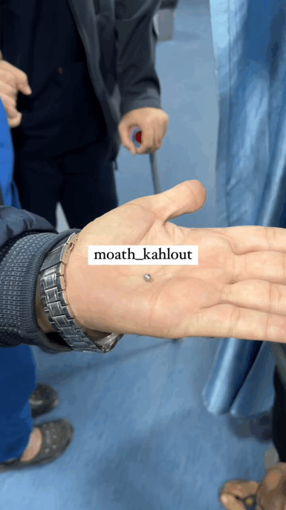 إحدى الشظايا التي أصيب بها مدير مستشفى كمال عدوان شمال غزة، د. حسام أبو صفية، بعد إلقاء طائرة مسيرة قنبلة على المستشفى.