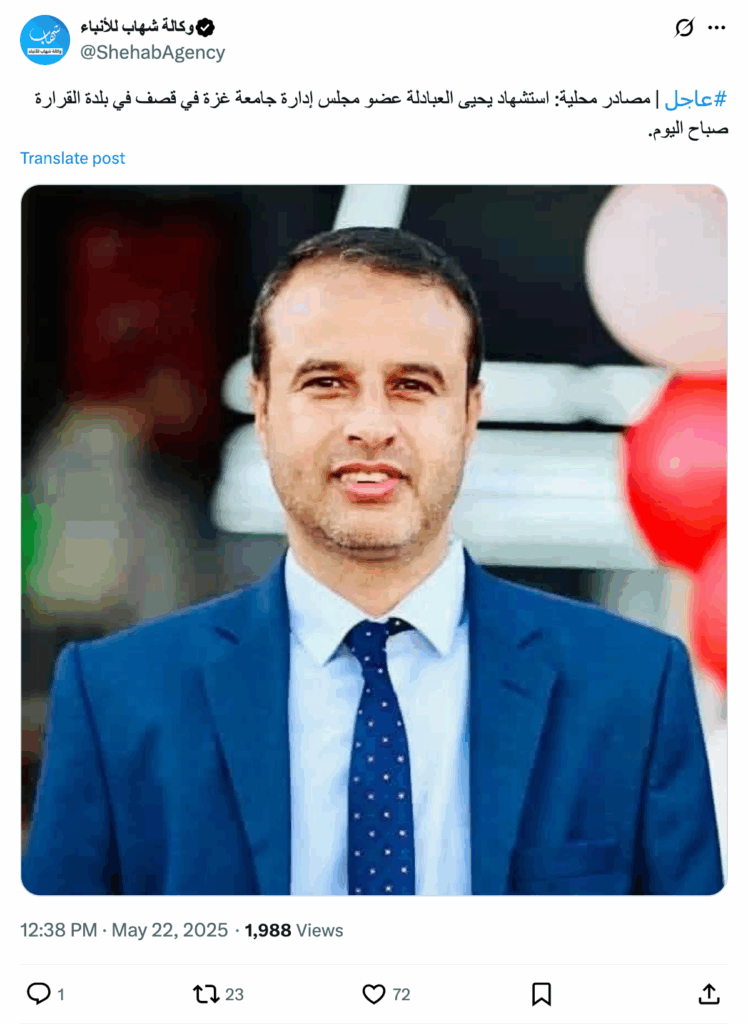 #Urgent | Local sources: Yahya Al-Abadlah, a member of the University of Gaza's Board of Directors, was martyred in a bombing in the town of Al-Qarara this morning.