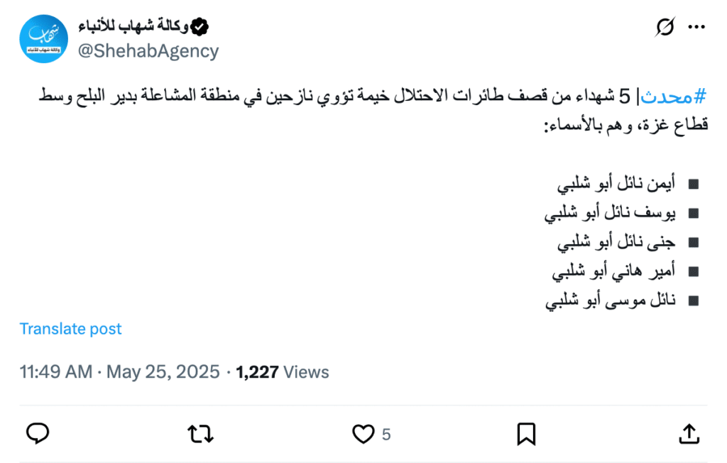 #Updated | 5 martyrs from the occupation aircraft bombing of a tent sheltering displaced people in the Al-Masha'la area in Deir al-Balah in the central Gaza Strip. They are: Ayman Nael Abu Shalabi, Yousef Nael Abu Shalabi, Jana Nael Abu Shalabi, Amir Hani Abu Shalabi, Nael Musa Abu Shalabi