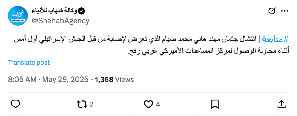 #متابعة | انتشال جثمان مهند هاني محمد صيام الذي تعرض لإصابة من قبل الجيش الإسرائيلي أول أمس أثناء محاولة الوصول لمركز المساعدات الأميركي غربي رفح.