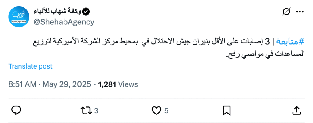 #متابعة | 3 إصابات على الأقل بنيران جيش الاحتلال في بمحيط مركز الشركة الأميركية لتوزيع المساعدات في مواصي رفح.