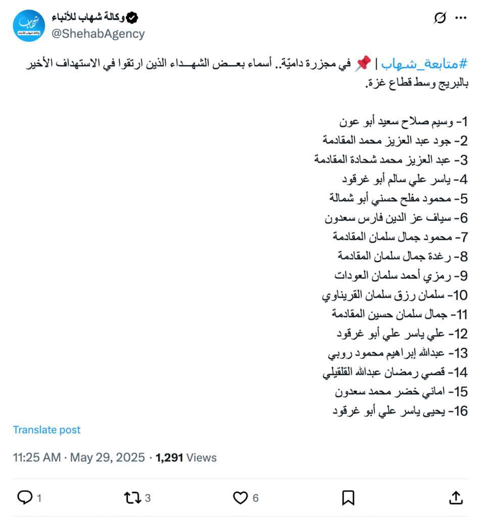 #متابعة_شهاب | في مجزرة داميّة.. أسماء بعـــض الشهـــداء الذين ارتقوا في الاستهداف الأخير بالبريج وسط قطاع غزة.