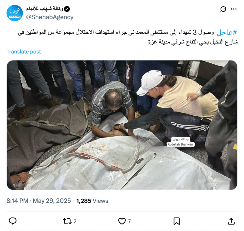 #Urgent | 3 martyrs arrived at the Baptist Hospital after the occupation targeted a group of citizens on Al-Nakhil Street in Al-Tuffah neighborhood, east of Gaza City.
