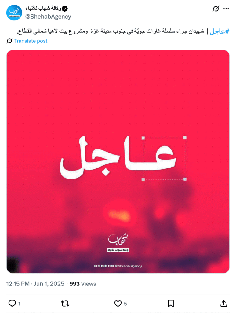 #Urgent | Two martyrs as a result of a series of airstrikes in southern Gaza City and the Beit Lahia project in the northern Gaza Strip.