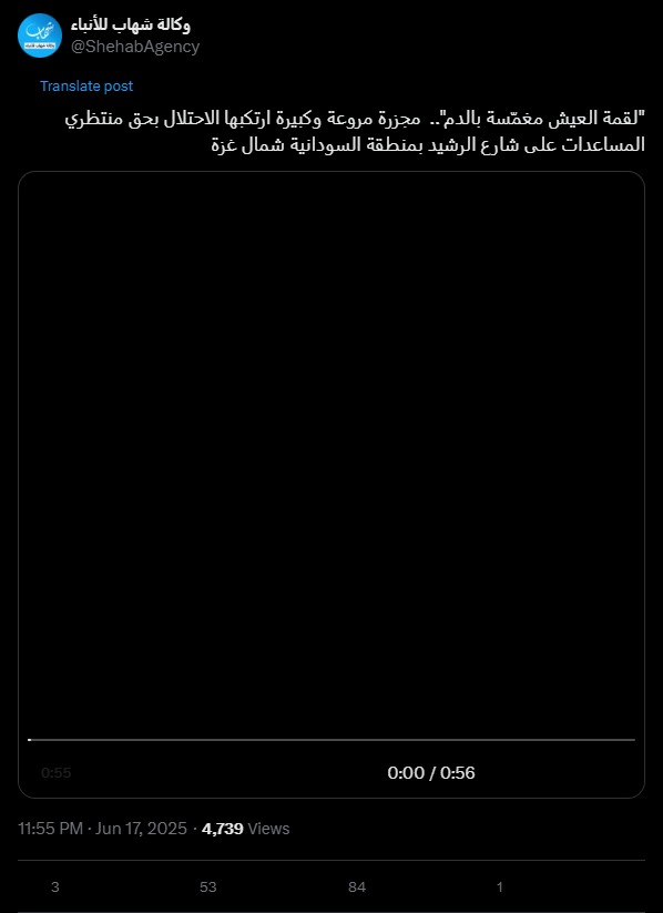 "A livelihood drenched in blood." A horrific massacre committed by the occupation against those waiting for aid on Rashid Street in the Sudanese area, north of Gaza.
