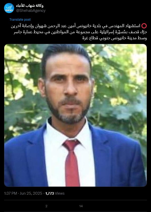 Khan Yunis Municipality engineer Amin Abdul Rahman Shahwan was killed and others were injured as a result of an Israeli drone strike on a group of citizens near the Jasser Building in the center of Khan Yunis, south of the Gaza Strip.