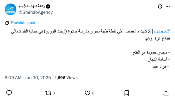 #Updated | 3 martyrs from the bombing of a medical point next to Halawa School (Zain Al-Wazir) in Jabalia Al-Balad, north of the Gaza Strip. They are: - lame Hamouda Abu Al-Fath - Osama Al-Najjar - Fouad Eid