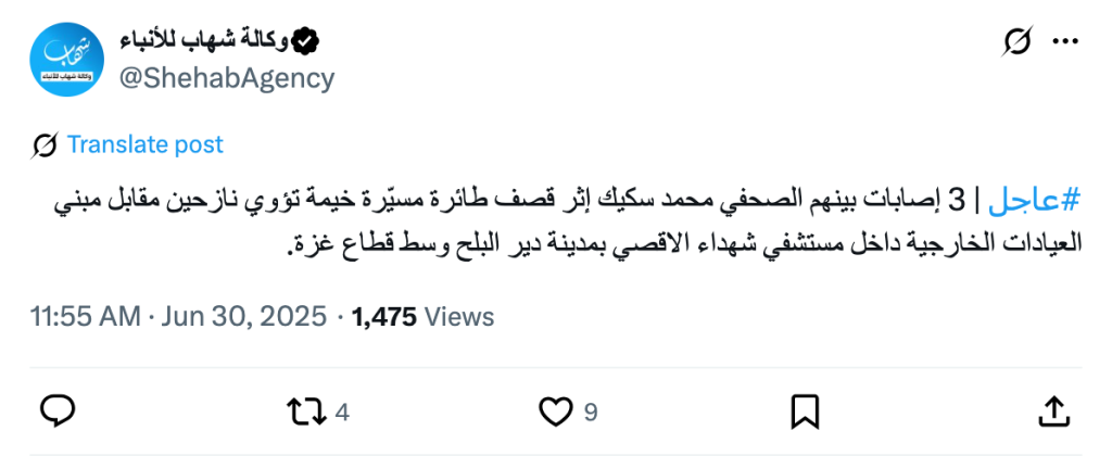 #Urgent | 3 injured, including journalist Mohammed Skeik, after a drone bombed a tent housing displaced people opposite the outpatient clinic building inside Al-Aqsa Martyrs Hospital in Deir al-Balah, central Gaza Strip.