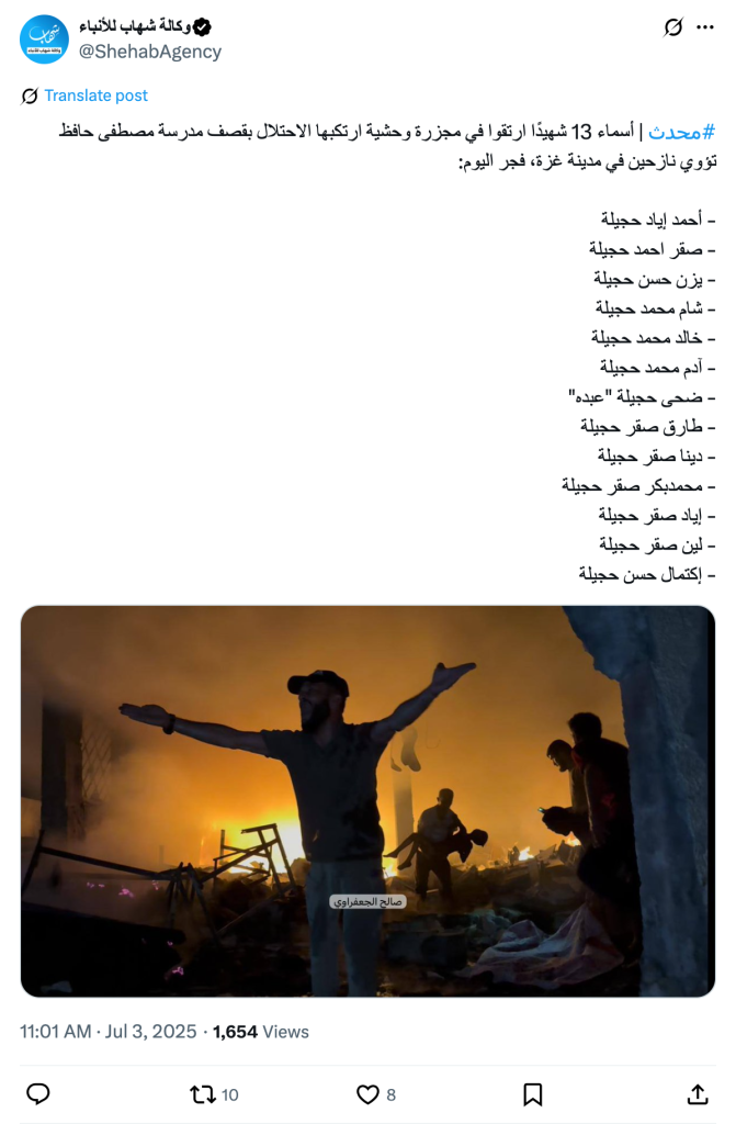 #Updated | The names of the 13 martyrs who were killed in a brutal massacre committed by the occupation forces when they bombed the Mustafa Hafez School, which shelters displaced people in Gaza City, at dawn today: - Ahmed Iyad Hajila - Saqr Ahmed Hajila - Yazan Hassan Hajila - Sham Muhammad Hajila - Khaled Muhammad Hajila - Adam Muhammad Hajila - Duha Hajila "Abdo" - Tariq Saqr Hajila - Dina Saqr Hajila - Muhammad Bakr Saqr Hajila - Iyad Saqr Hajila - Leen Saqr Hajila - Iktimal Hassan Hajila