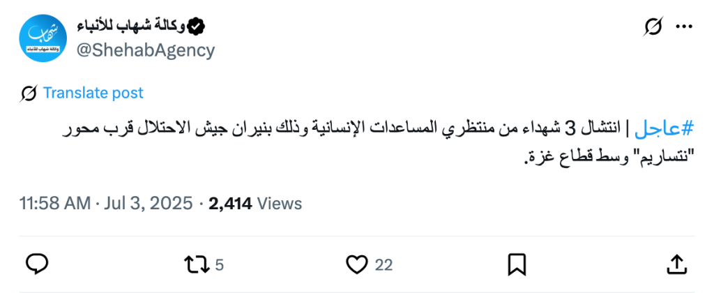 #Urgent | 3 martyrs waiting for humanitarian aid were recovered by Israeli army fire near the Netzarim axis in the central Gaza Strip.