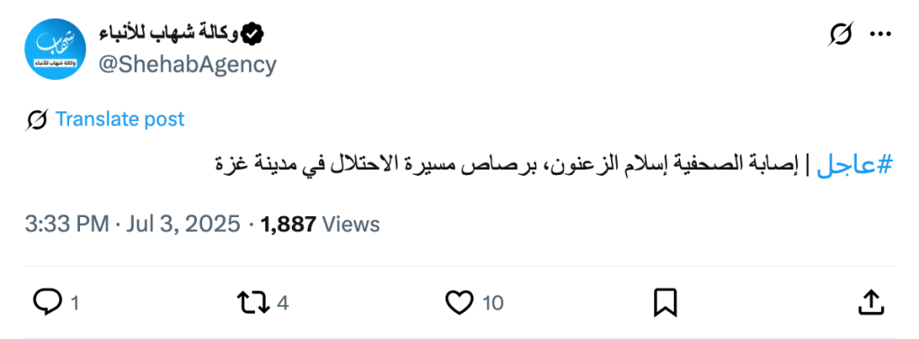 #عاجل | إصابة الصحفية إسلام الزعنون، برصاص مسيرة الاحتلال في مدينة غزة