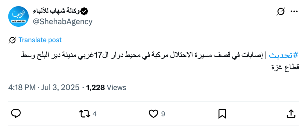 #Update | Injuries reported after an Israeli drone bombed a vehicle near Roundabout 17, west of Deir al-Balah, in the central Gaza Strip.