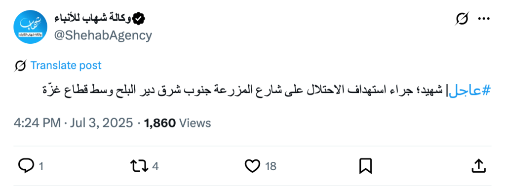 #Urgent | A martyr was killed as a result of the occupation forces' targeting of Al-Mazra'a Street, southeast of Deir al-Balah, in the central Gaza Strip.