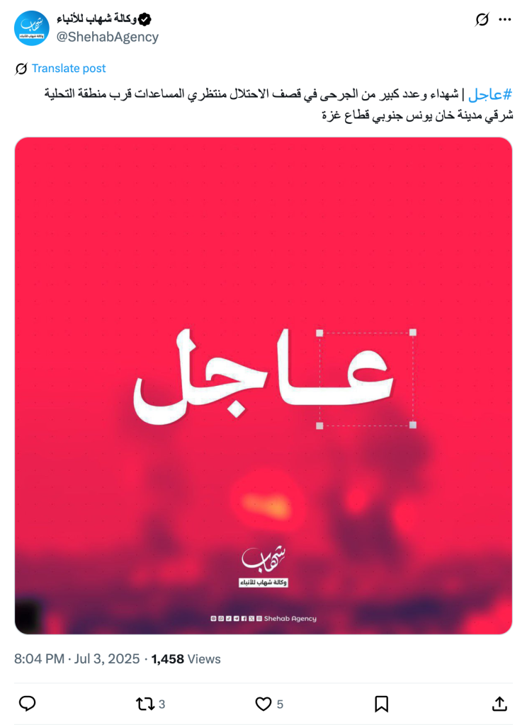 #Urgent | Martyrs and a large number of wounded in the occupation's bombing of those waiting for aid near the Tahlia area east of Khan Yunis, south of the Gaza Strip.
