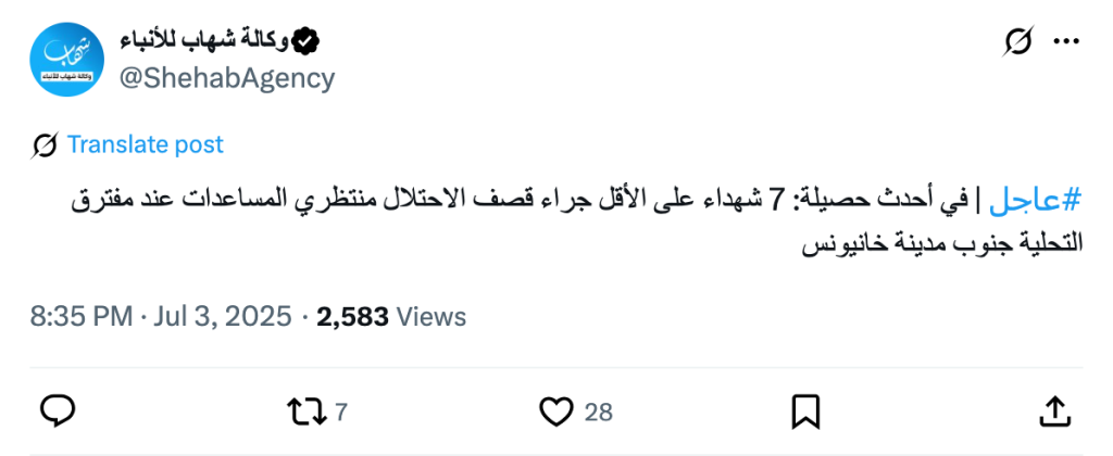 #عاجل | في أحدث حصيلة: 7 شهداء على الأقل جراء قصف الاحتلال منتظري المساعدات عند مفترق التحلية جنوب مدينة خانيونس