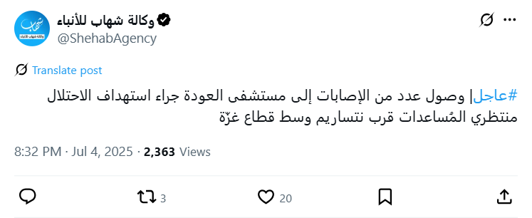 #عاجل| وصول عدد من الإصابات إلى مستشفى العودة جراء استهداف الاحتلال منتظري المُساعدات قرب نتساريم وسط قطاع غزّة