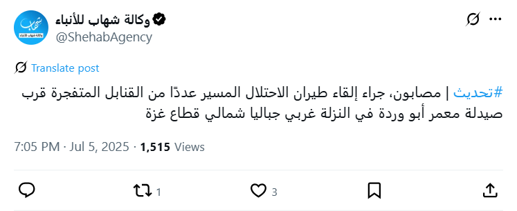 #تحديث | مصابون، جراء إلقاء طيران الاحتلال المسير عددًا من القنابل المتفجرة قرب صيدلة معمر أبو وردة في النزلة غربي جباليا شمالي قطاع غزة