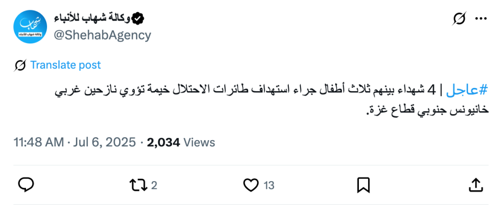 #عاجل | 4 شهداء بينهم ثلاث أطفال جراء استهداف طائرات الاحتلال خيمة تؤوي نازحين غربي خانيونس جنوبي قطاع غزة.