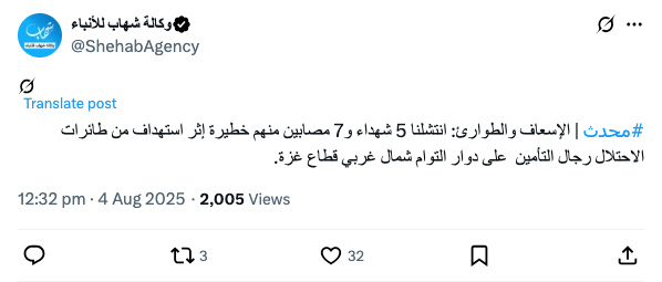 #Update | Ambulance and Emergency: We recovered 5 martyrs and 7 injured, some seriously, after Israeli aircraft targeted security personnel at Al-Tawam Roundabout, northwest of the Gaza Strip.