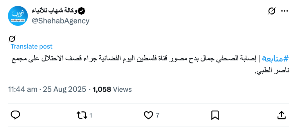 #متابعة | إصابة الصحفي جمال بدح مصور قناة فلسطين اليوم الفضائية جراء قصف الاحتلال على مجمع ناصر الطبي.
