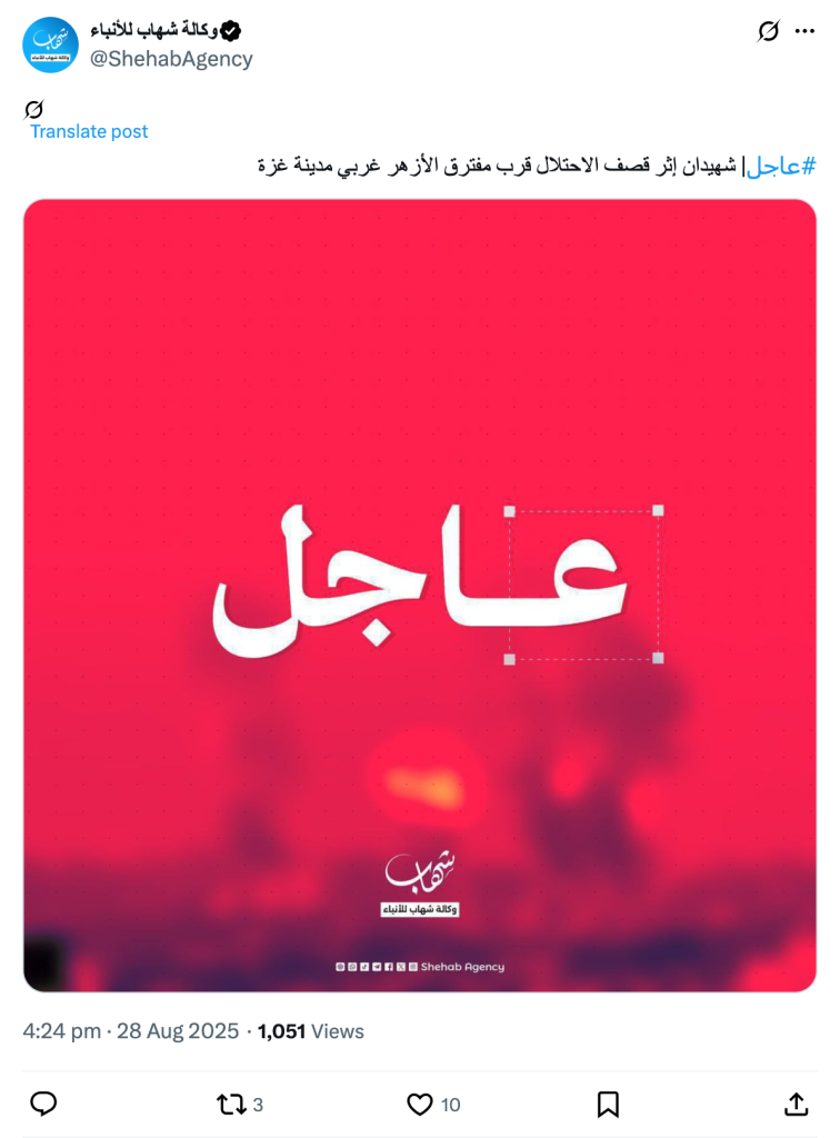 #Urgent | Two martyrs as a result of the occupation's bombing near Al-Azhar Junction, west of Gaza City.