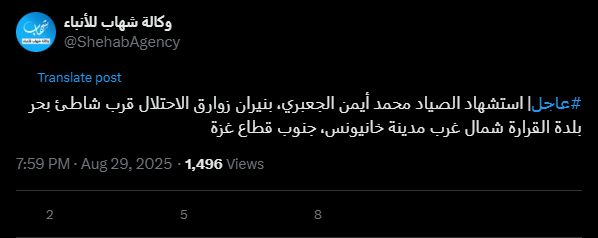 #Urgent | Fisherman Mohammed Ayman Al-Ja'bari was killed by Israeli gunfire near the shore of Al-Qarara town, northwest of Khan Yunis, in the southern Gaza Strip.