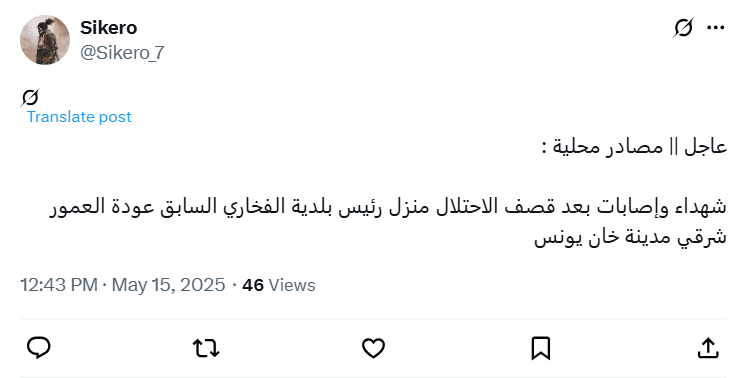 Urgent || Local sources: Martyrs and injuries after the occupation forces bombed the home of the former mayor of Al-Fakhari, Awda Al-Amour, east of Khan Yunis.