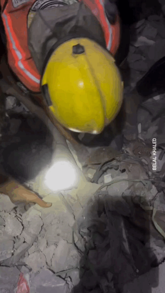 انتشال الشهداء من تحت أنقاض منزل حمدان الذي استهدفته طائرات الاحتلال في خانيونس جنوب قطاع غزة