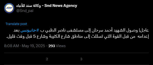 عاجل| وصول الشهيد أحمد سرحان إلى مستشفى ناصر الطبي ب #خانيونس بعد إعدامه من قبل القوة التي تسللت إلى مناطق شارع الكتيبة وشارع 5 قبل وقت قليل.