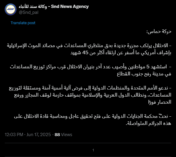 - استشهد 5 مواطنين وأصيب عدد آخر بنيران الاحتلال قرب مراكز توزيع المساعدات في مدينة رفح جنوب القطاع